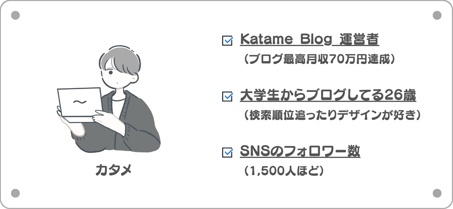 この記事を書いてる僕、カタメは大学生の時にブログのみで最高月収70万円を達成しており、KatameBlog以外のブログも含め150記事以上の記事を書いてきました